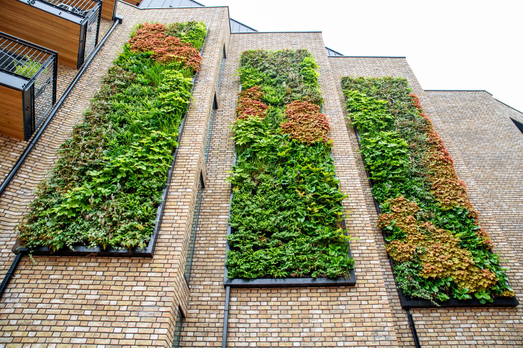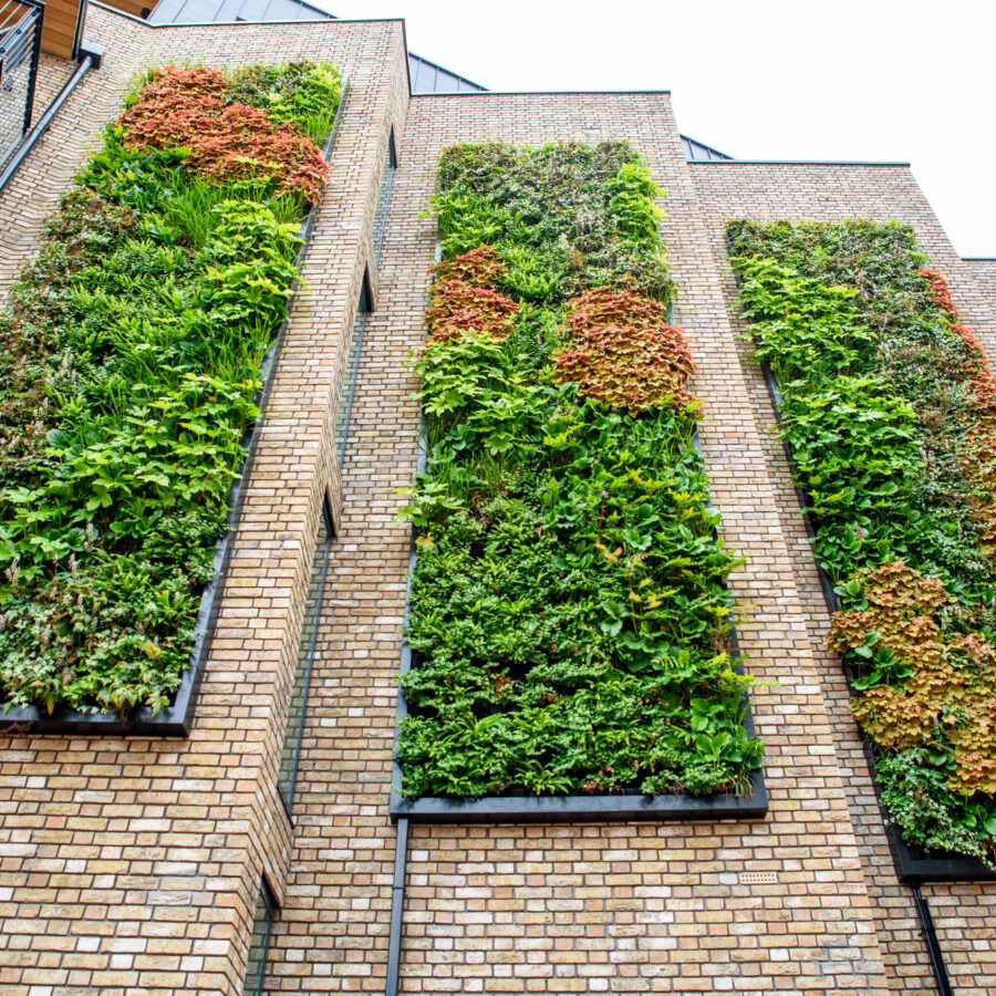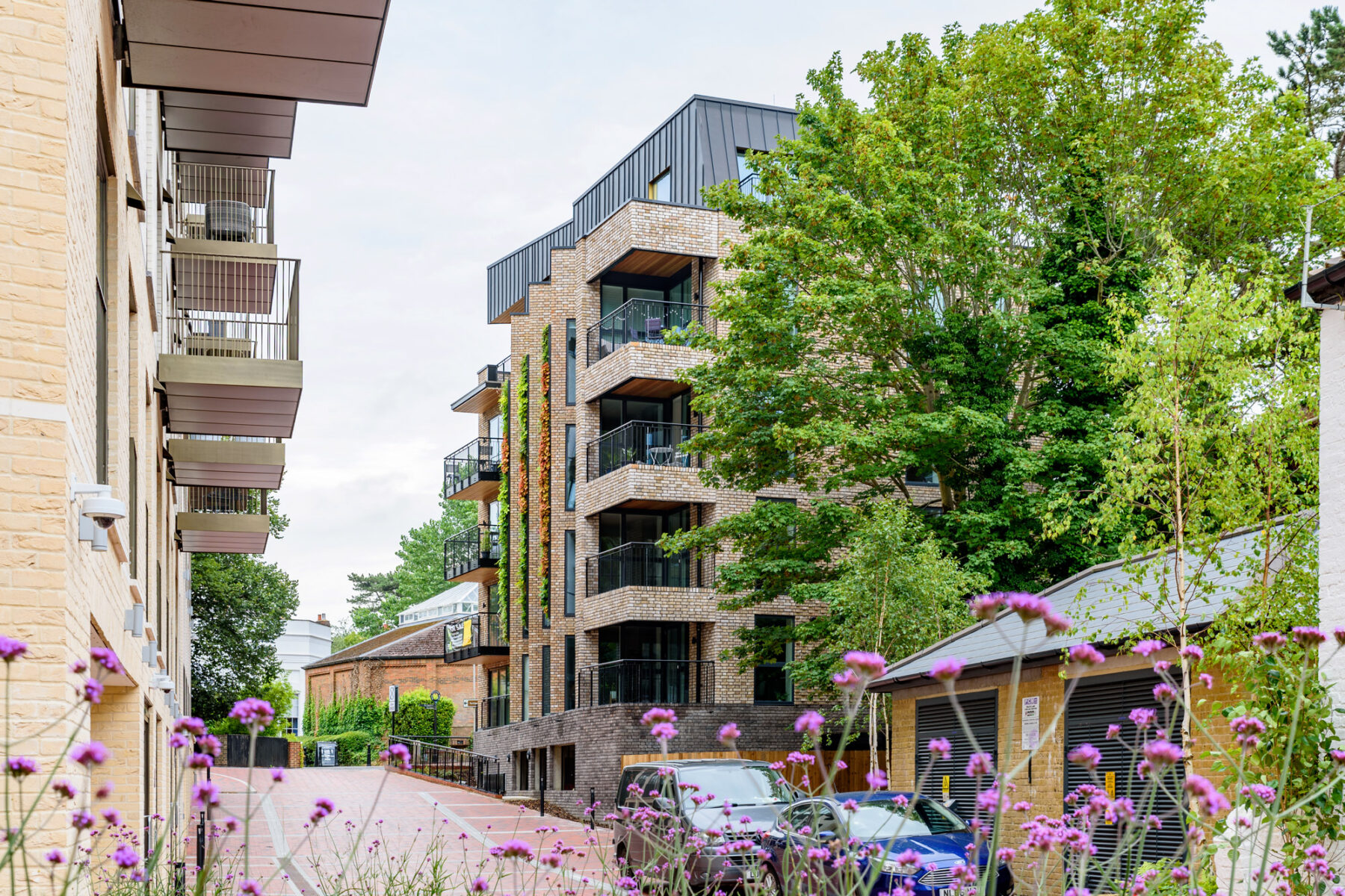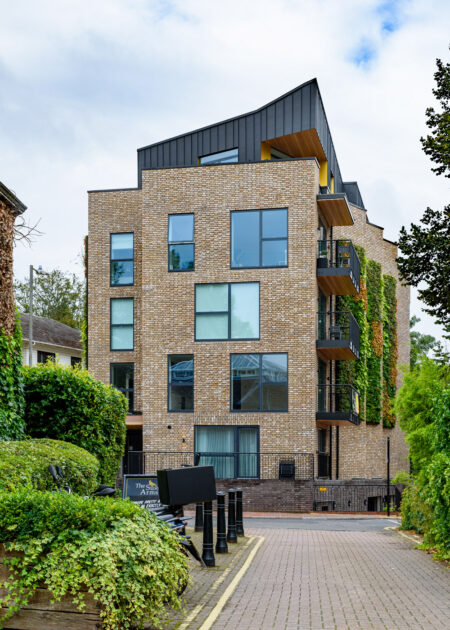 The height and scale of the building mark a transition between the ‘arcadian’ scale of villas on one side of the site and the large ‘urban’ apartment building on the other. External materials and details on the lower floors taking reference from the local context include brick, vertically hung tiles, plinths and iron railings. A black zinc-clad penthouse confers a bold, contemporary profile to the roofscape that reinforces the relationship to buildings in the Pantiles. Planters and living walls further help to root the building within the area of landscape importance.