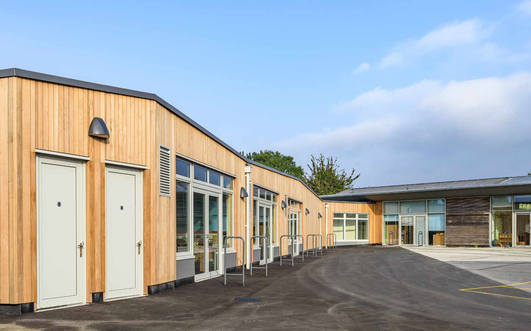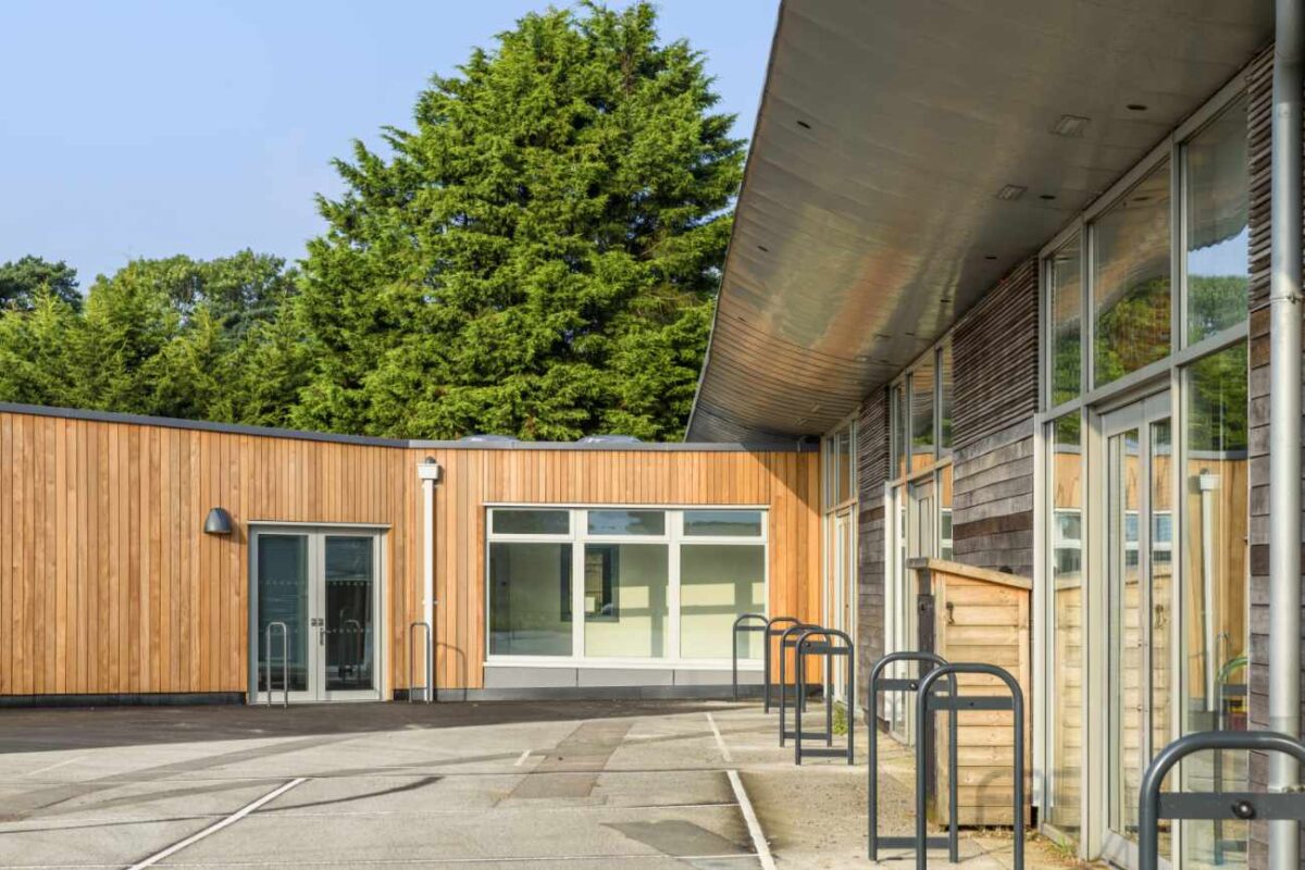 HMY proposed that only the material language of the base of the existing building (timber cladding) is continued to its extension, with no roof projections. The design is also informed by an idea of its form as a solid timber mass from which volumes are removed where large areas of glazing (classrooms) and recesses (main entrance) are required. To respond to the change in level inside the building and to give the extended school a unique (though sympathetic) appearance, the profile of the top of the wall varies around the building. The site planning involved the reconfiguration of the main playground and the creation of a new and generous car park / drop-off area