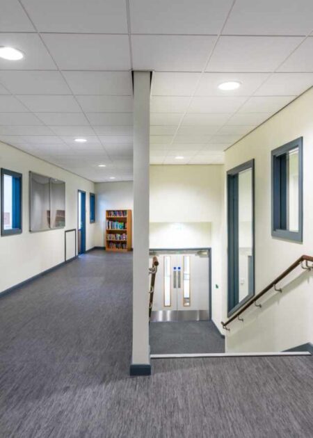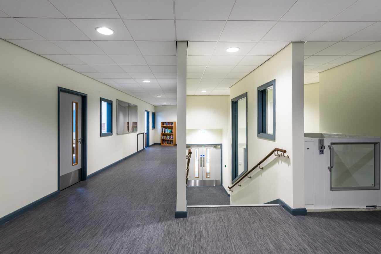The accommodation within the extension is arranged around a spine corridor extending from the new reception and connecting to the existing school circulation. The new classrooms are grouped in clusters off this route at the same level as the existing accommodation, providing level access to the playground. The reception / administration block is set at a lower level at the front of the site, thereby creating a more visible entrance and giving the school a new and strong presence from the road.