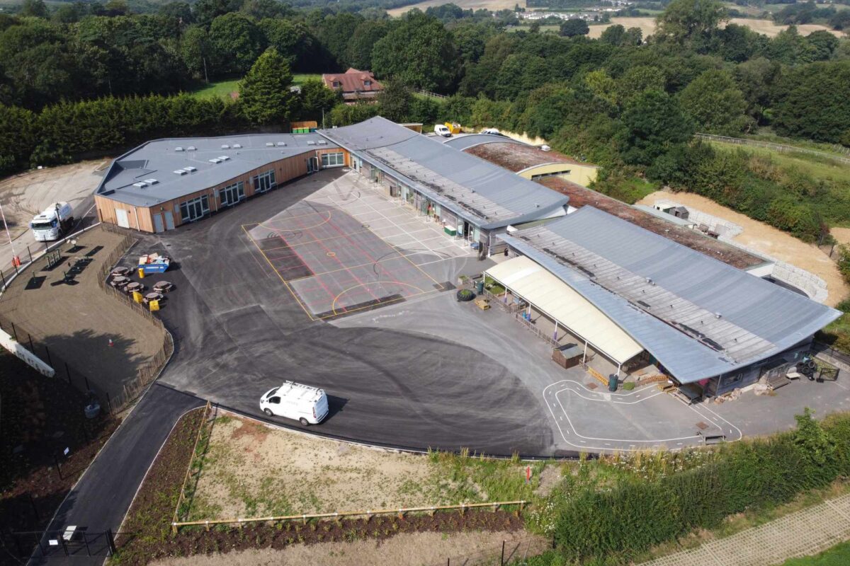 Challenges of the project included: a constrained, sloping site (with the existing school set 2m above the entrance roadway), limited opportunity to expand the drop-off/pick up area, its location at the edge of the North Downs Area of Outstanding Beauty and the distinctive longitudinal form of the existing building and presence of a large oversailing roof.